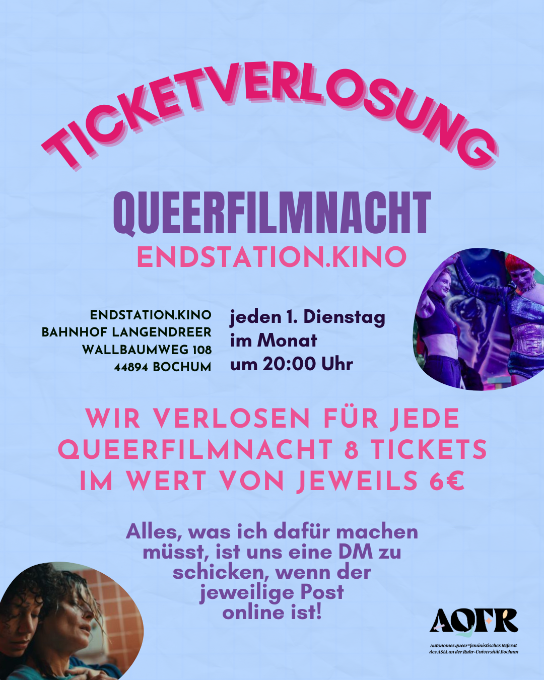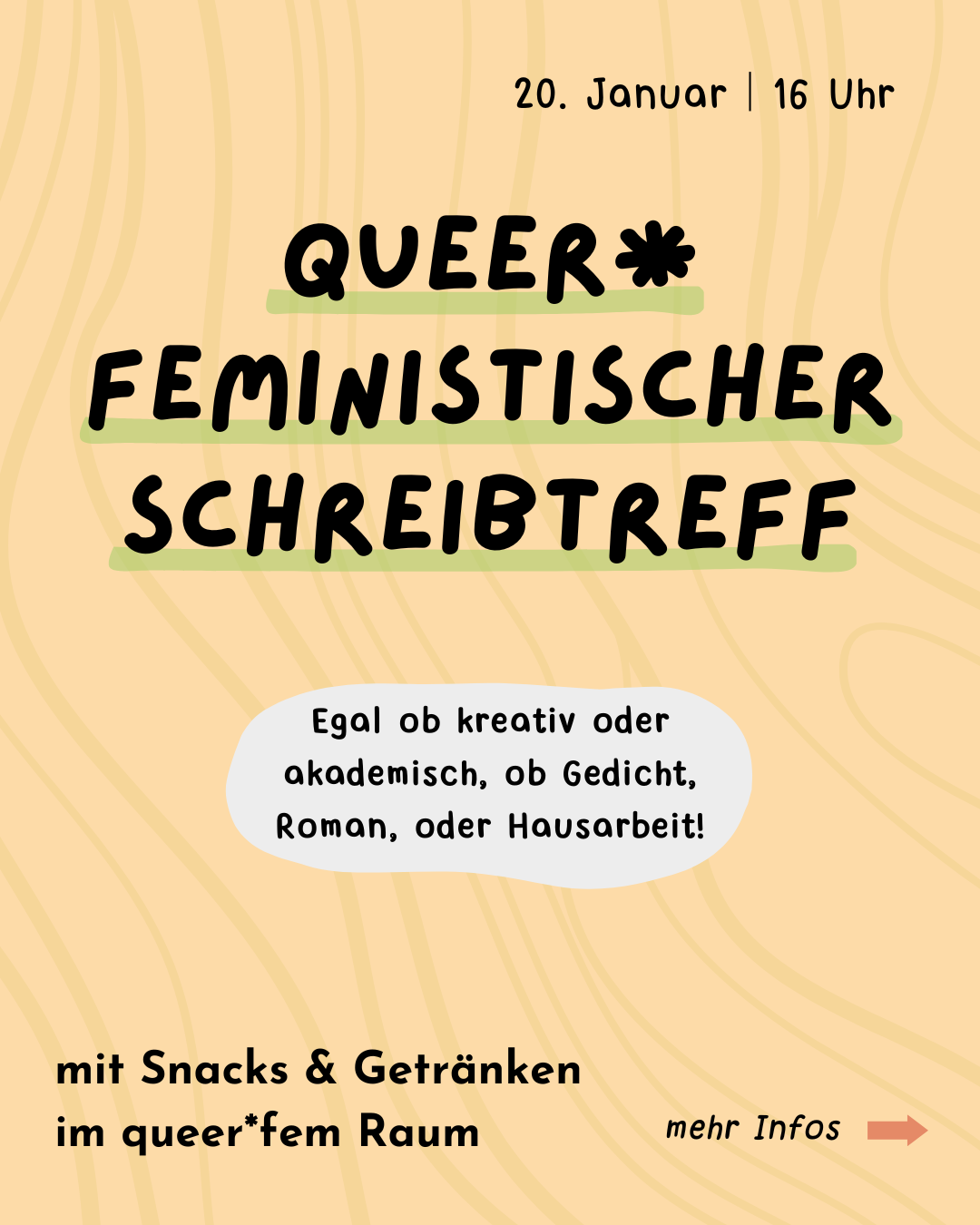 Queer*feministischer Raum GA 04/61 Universitätsstraße 150, Bochum, Nordrhein-Westfalen, DeutschlandT*Time – Treffpunkt für alle Student*innen an der RUB, die sich als trans*, nonbinary, oder agender identifizieren oder sich ihrer geschlechtlichen Identität unsicher sind. Gemeinsam mit dem Autonomen Schwulen*referat (ASR) bieten wir im queer*feministischen Raum (GA 04/61) Getränke, Snacks, Spiele und eine gemütliche Atmosphäre für Gespräche. Für den Ablauf des Abends gibt es keinen festen… T*time | Offenes trans*Café weiterlesen