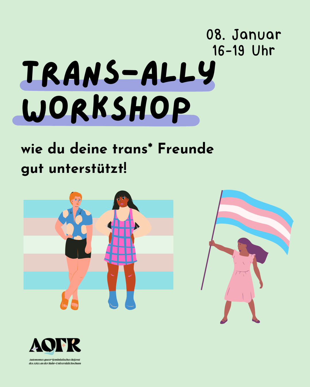 Was bedeutet es, trans* Ally zu sein? Wie verstehe ich meine trans* friends am Besten und wie kann ich sie unterstützen? Daum soll es in diesem Workshop gehen! Der Workshop soll nicht nur einen offenen Einblick in das Leben von trans* Personen ermöglichen, sondern auch offen sein für alle möglichen Fragen die ihr habt -… Trans* Ally Workshop weiterlesen